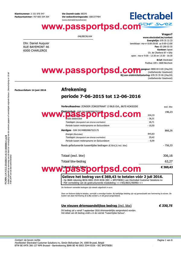 The fake Belgium Utility Bill you order here will look Authentic and Real. The Bill will be custom made with your name, address, and other details on it. We will deliver the bill in JPG or PDF scanned file.